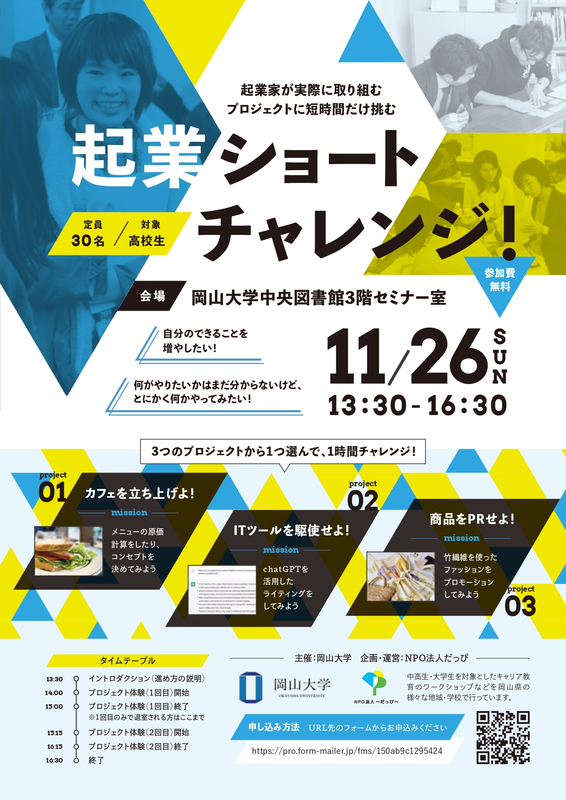 起業家が実際に取り組むプロジェクトに、高校生が短時間だけ挑んでみる体験型イベントです!